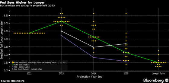 美联储上月政策会议的点阵图显示,19名美国联邦公开市场委员会(FOMC)中有 17 位官员预计利率将达到 5% 或更高的峰值,这高于当前市场预期的水平。但美联储在 2021 年时也未能预料到 2022 年会出现如此激进加息的场景。因此,当前美联储和市场都在互相认为对方正在“犯错”。