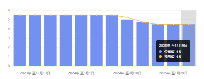 3 月 19 日,美联储在联储的货币政策委员会 FOMC 会后宣布,联邦基金利率的目标区间继续保持在 4.25% 至 4.5% 不变。这是美联储连续第二次货币政策会议决定暂停降息。美联储自去年 9 月起连续三次会议降息,合计降幅 100 个基点。