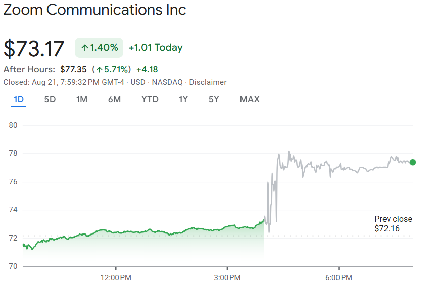 受强劲企业需求推动,Zoom 预计第三季度营收将达 12.3 亿美元,高于市场共识的12.11 亿美元,同时上调全年指引,全年营收预计约 48.3 亿美元,EPS 在 5.81 至 5.84 美元区间,均优于市场预期。消息公布后,Zoom 股价盘后上涨近 6%。