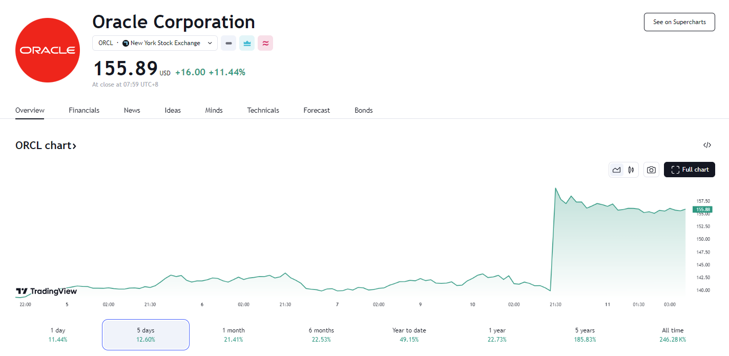 10 日,甲骨文(ORCL.US)收涨 11.44%,报 155.89 美元,创下历史收盘新高,总市值 4296.11 亿美元。