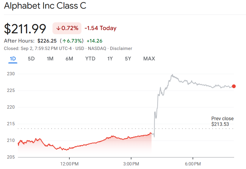 消息公布后,Alphabet 股价在盘后交易中一度飙升逾 6%。