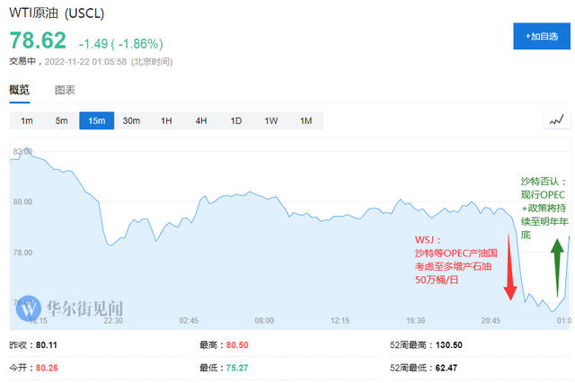 有消息称, OPEC+ 考虑 11 月增产多 50 万桶/日,国际油价一度大跌 6% ,齐创今年 1 月来最低。沙特随后否认,称大幅减产 200 万桶/日将持续到 2023 年年底,油价短线跃升,一度小幅转涨。