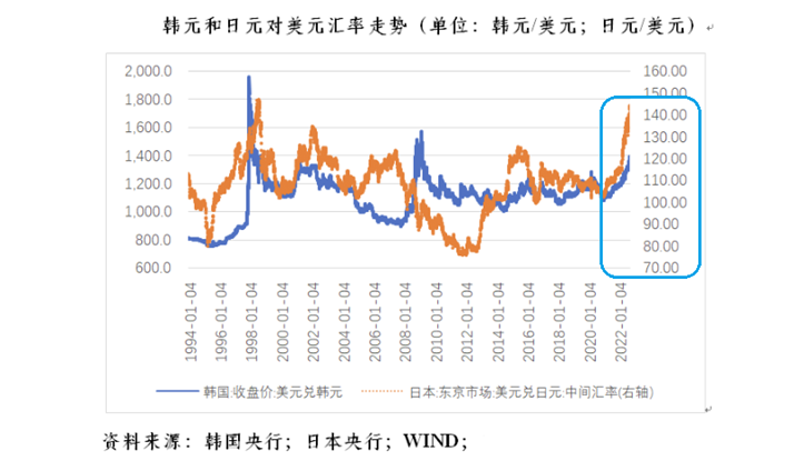 去年初至今年 9 月 16 日,美元指数累计上涨 21.9%,韩元汇率累计贬值 21.6%,日元汇率累计贬值 27.6%。韩元跌幅相对日元要小,主要反映了两国相对美国经济周期和货币政策周期的差异。