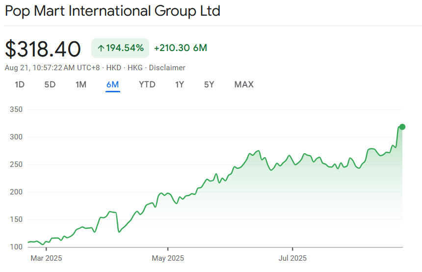 8 月 21 日,泡泡玛特(HK:9992)股价再创历史新高。