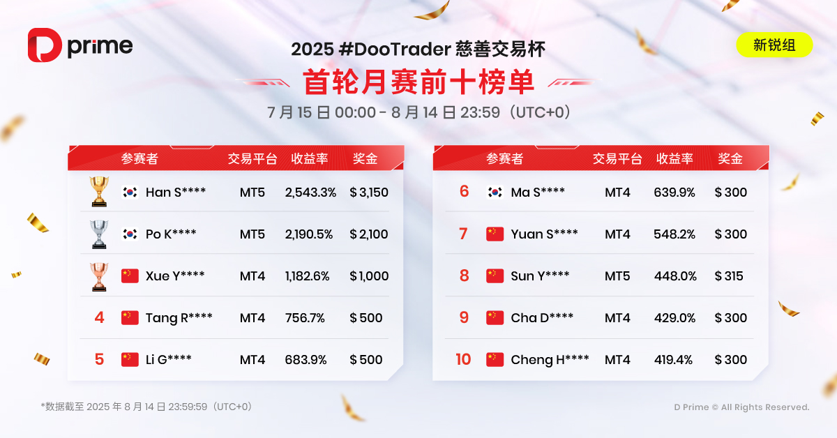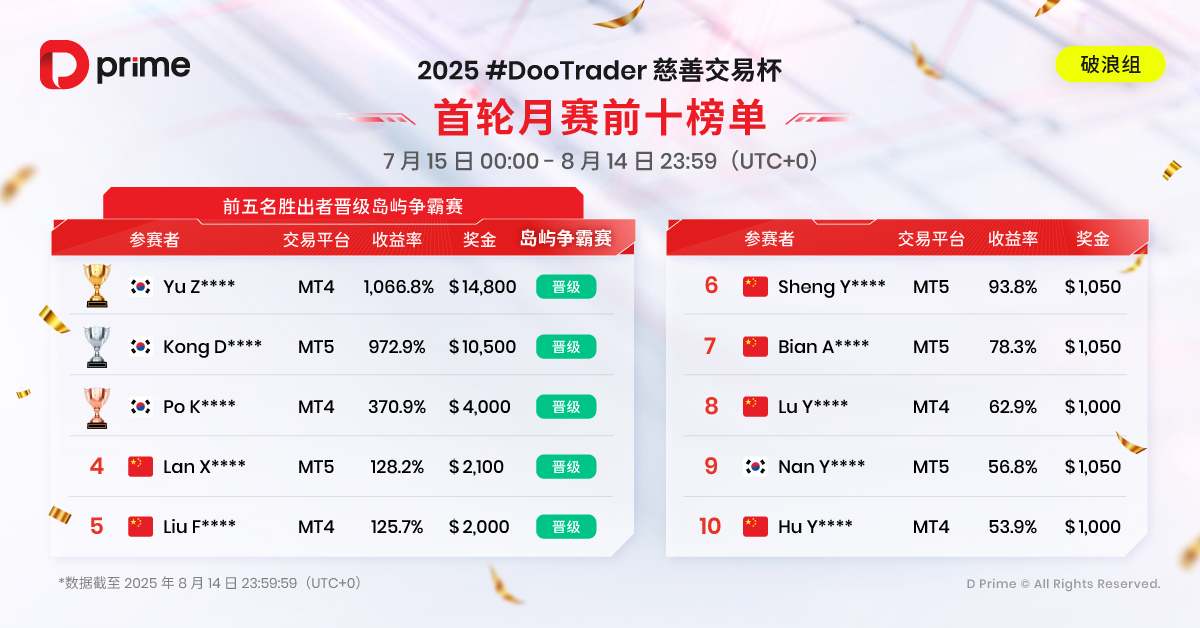 2025 年 D Prime #DooTrader 慈善交易杯首轮月赛于 8 月 14 日 23:59(UTC+0)圆满落幕,第一轮榜单已火热出炉!第二轮月赛紧随开启,已于 2025 年 8 月 15 日 00:00(UTC+0)鸣锣开战 —— 欢迎各路交易高手即刻报名,争夺决赛入场券!