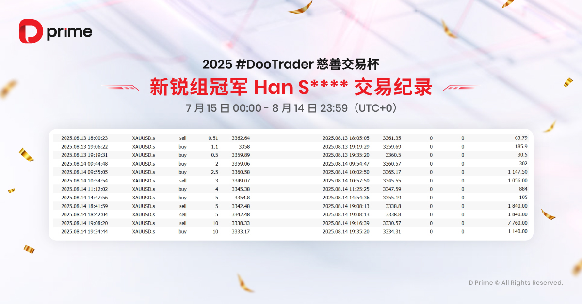 更值得一提的是,2025 #DooTrader 慈善交易杯将继续传递慈善之力。每当您在比赛中完成 1 手交易,D Prime 都将代表您捐出 0.1 美元,帮助改善贫困儿童的教育条件,让您的每一笔交易,不仅是收益,更是一份温暖的心意,助力点亮更多孩子的未来。