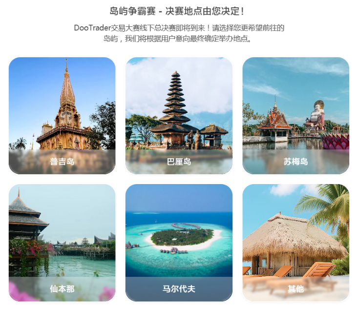 D Prime #DooTrader 慈善交易杯经历了为期 6 个月的六轮月赛精彩角逐后,其中中国队 19 人、韩国队 7 人、日本队 3 人﹑印度队 1 人已经闯入岛屿争霸赛决赛舞台!而最终的冠军舞台地点,正等待全球交易者亲手投票选出!