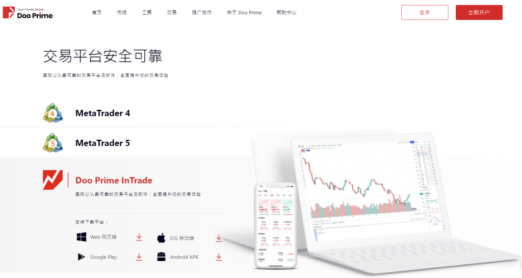 凭借强大的金融科技基础设施、密切的合作伙伴关系、资深的技术团队,Doo Prime 始终为投资者提供安全可靠的交易环境、具有竞争力的交易成本、极速的交易执行通道,在 MT4、MT5、TradingView、InTrade 等多个行业领先的交易终端上提供超过 1 万种交易产品,支持 10 种不同货币的存取款方式,7*24 小时的多语言客户服务。
