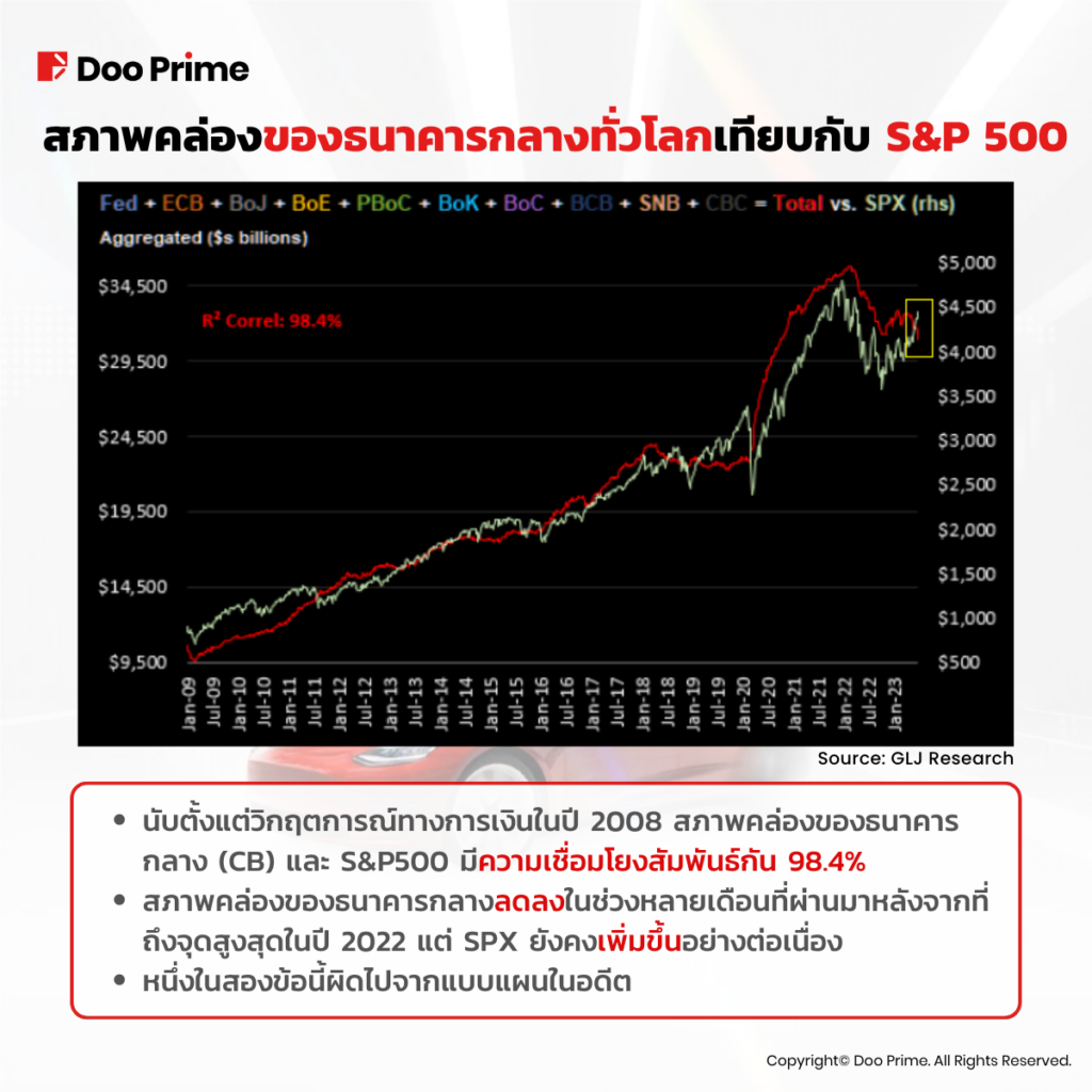 ความสัมพันธ์ที่ 98.4% หมายความว่าความสัมพันธ์ระหว่างสภาพคล่องและ S&P 500 ค่อนข้างแข็งแกร่ง กล่าวอีกนัยหนึ่งคือ หากสภาพคล่องลดลง หน่วยงานหลัก เช่น กองทุนเฮดจ์ฟันด์และวาณิชธนกิจรายใหญ่มักจะต้องขายหุ้นตามไปด้วย ซึ่งนำไปสู่การกลับตัวของตลาดหุ้น