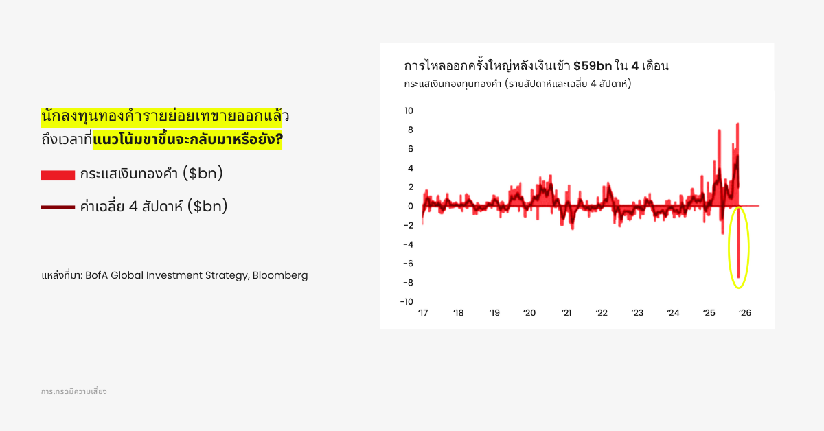 อมูลเผยให้เห็นว่า มีการไหลออกจากกองทุนทองคำเป็นมูลค่ารวมกว่า 59 พันล้านดอลลาร์ ภายในระยะเวลาเพียง 4 เดือนที่ผ่านมา ในภาษาของนักเทรด ช่วงนี้คือเวลาที่ “นักลงทุนขาจร” หรือกลุ่มนักเก็งกำไรระยะสั้นที่ตื่นตระหนกทุกครั้งเมื่อราคาย่อตัว เริ่มทยอยออกจากตลาด