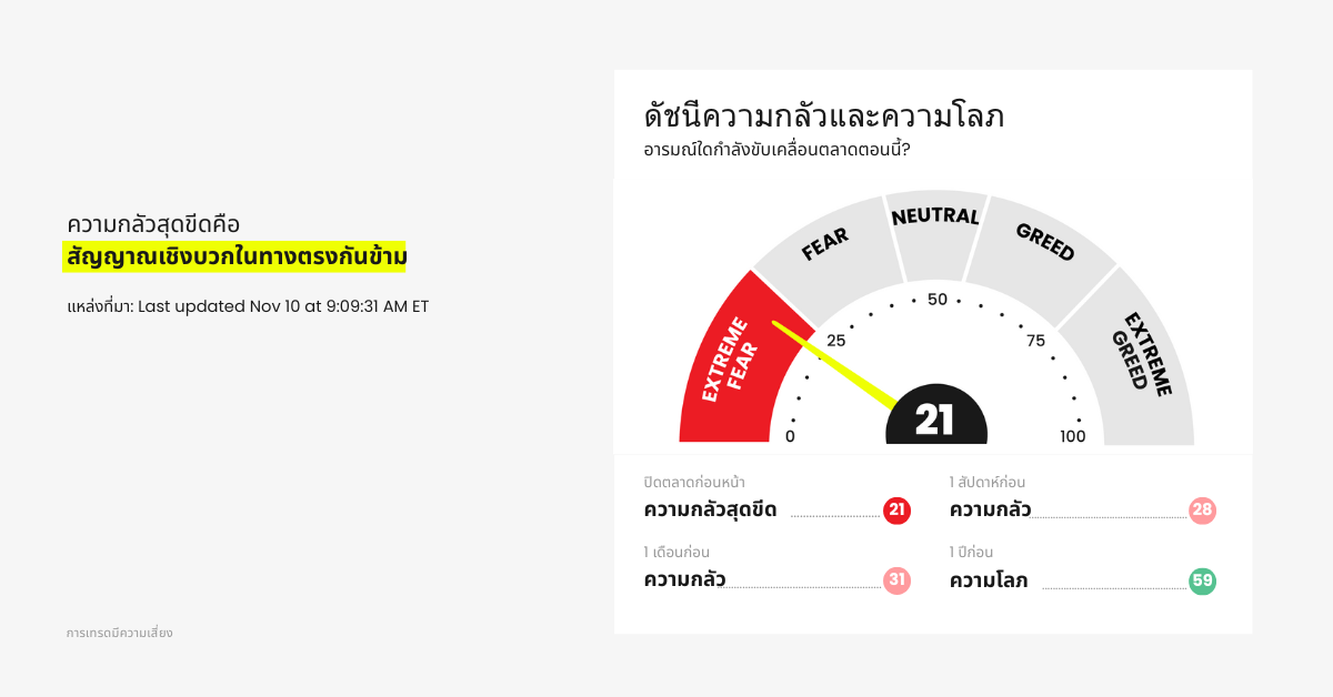 ตามดัชนี Fear & Greed Index ของ CNN ตลาดในตอนนี้อยู่ในโซน “Extreme Fear” โดยมีคะแนนเพียง 21 จาก 100