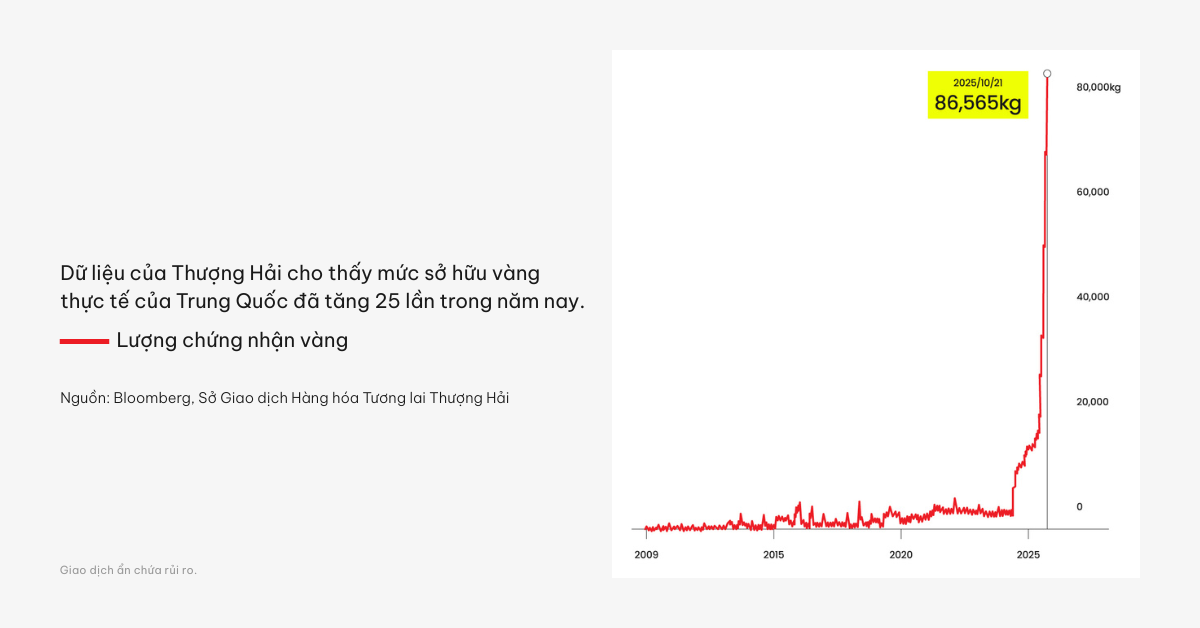 Lệnh mua vàng tại Thượng Hải đã đạt mức kỷ lục 86,565 kg vào tháng 10 năm 2025. Đây là mức tăng gấp 27 lần so với năm 2024, và tăng hơn 550% chỉ trong năm nay.