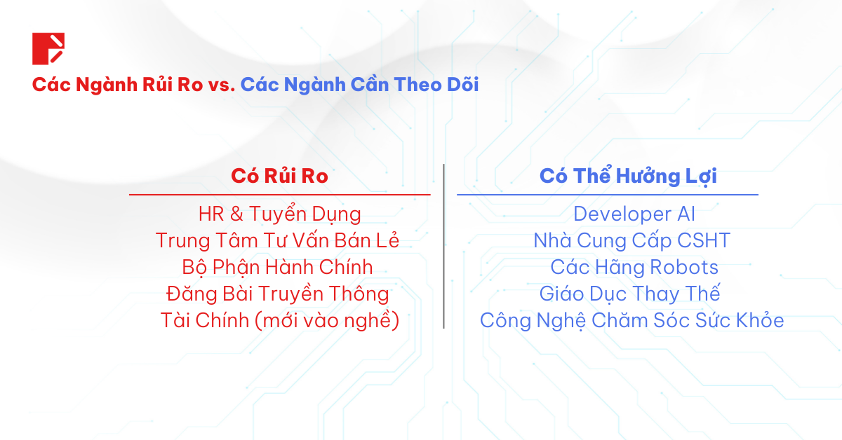 Những ví dụ này làm nổi bật lên một xu hướng đang trên đà phát triển: Khi các công ty áp dụng công nghệ AI, họ thường sẽ tái cấu trúc lực lượng lao động của mình, từ đó dẫn đến việc mất cơ hội việc làm ở một số lĩnh vực, trong khi sẽ tạo ra một số cơ hội mới ở những lĩnh vực khác.
